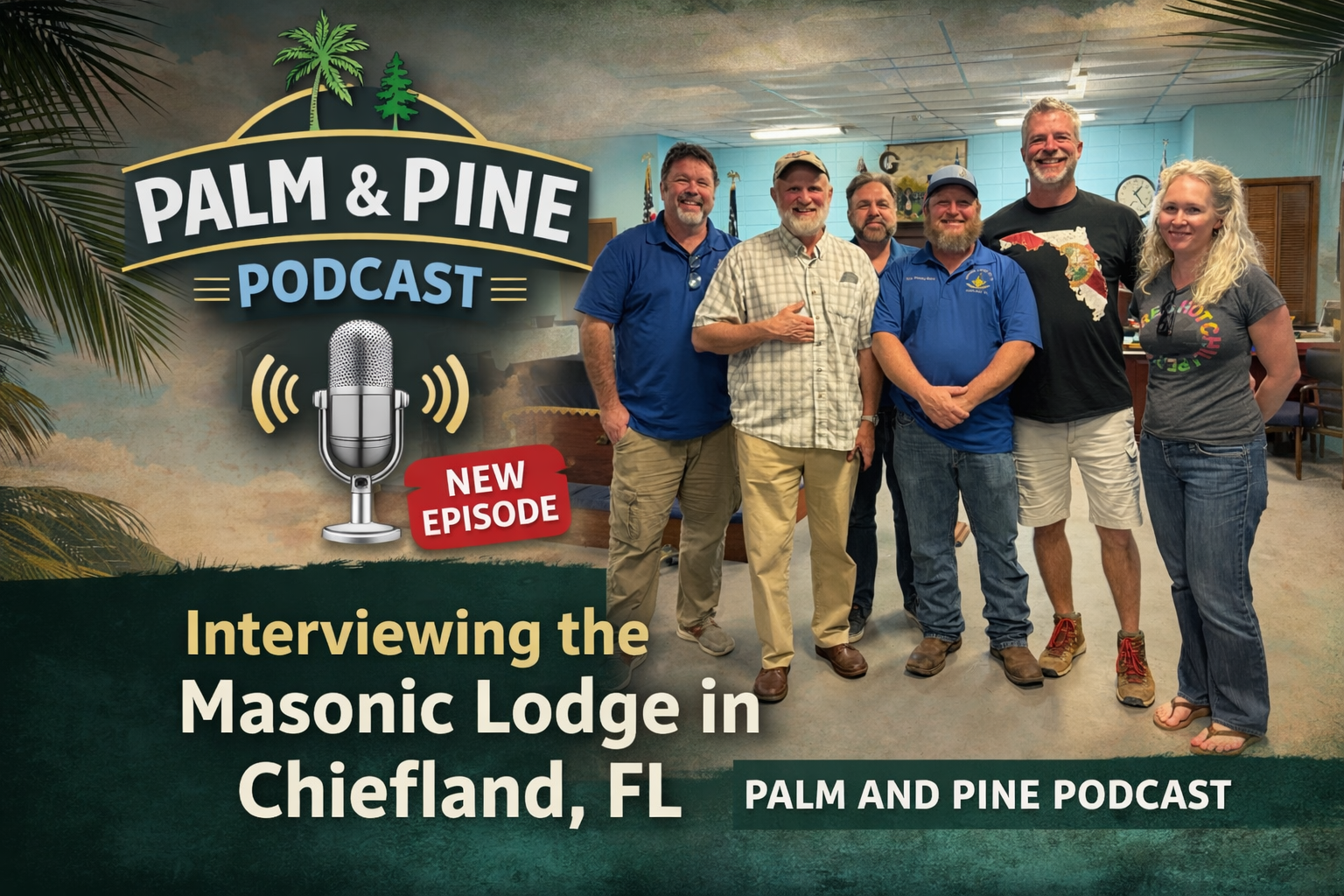NEW! 10 Mar. 2026 (77). Inside the Masonic Lodge: Secrets, History and Truth About Freemasonry, Brown Lodge No. 51 in Chiefland, Florida. On this special episode of the Palm and Pine Podcast, the boys of Old Florida receive a rare invitation inside a real Masonic Lodge. We travel to the small North Florida town of Chiefland to sit down with the leadership of Brown Lodge No. 51 F&AM and learn firsthand about one of the most talked about and most misunderstood fraternities in the world: Freemasonry. For centuries, the Masons have been surrounded by rumors, myths, and conspiracy theories. Are they secret rulers of the world? A mysterious cult? Or, something more ordinary?